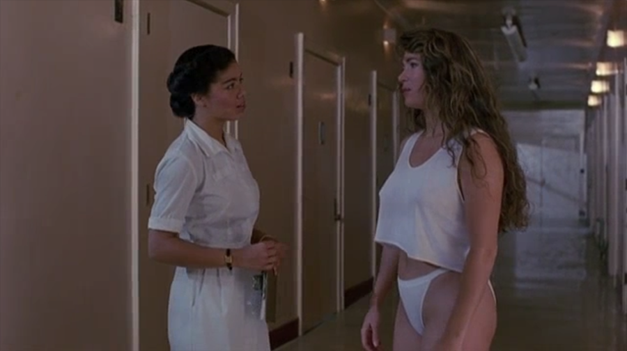 Which is something I wish someone had said to the writer of this slop. THE DEAD PIT opens with a nine-minute credit sequence. That should adequately describe the pacing of this film. Calling it leisurely would be too kind. It’s positively geriatric. That’s probably why Brett Leonard has his lead actress, Cheryl Lawson, spend most of the movie in her underwear. In one of her many, many nightmare sequences, Jane gets tied up in a shower and sprayed with a garden hose until her tissue-thin tank top is torn clean off her body. Why? Because it’s easier than generating suspense or intrigue.