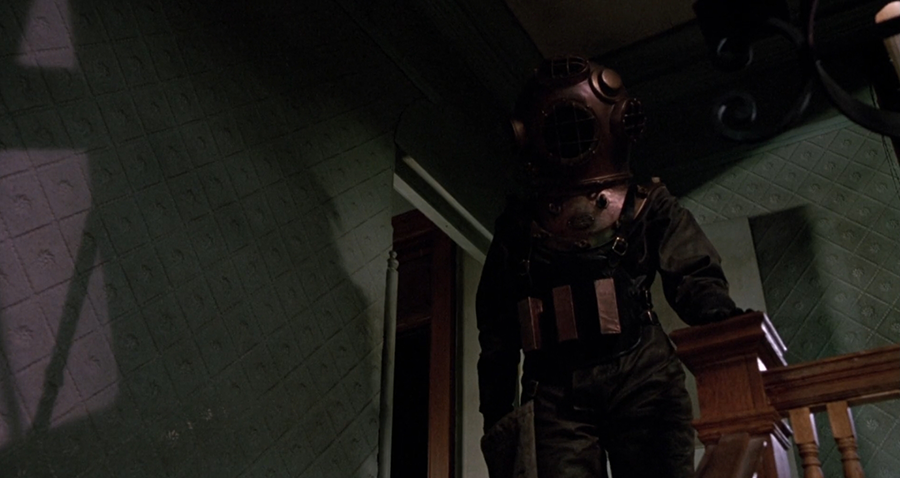 And that is when the person in a deep-sea diver costume starts prowling around. Oh, did I forget to mention that, for some reason, everyone is wearing costumes at an April Fools' Day party? Yeah, that’s a thing, and so are the many, many deaths that occur within about five minutes. People are drowned, stabbed, shot with harpoons, impaled with a pitchfork, you name it. A real bloodbath. If only our leads noticed any of it happening.