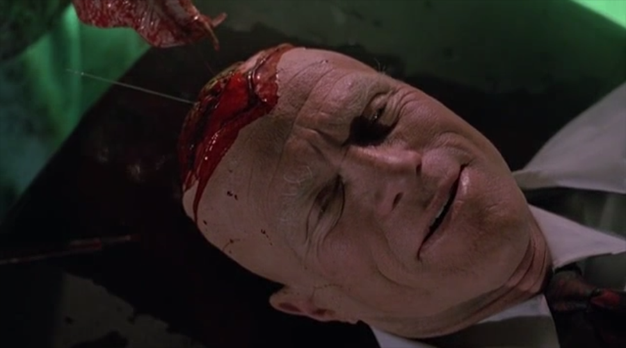I felt bad for Lawson. She’s absolutely giving it her all in a film that isn’t reciprocating. Once the halfway mark hits, the movie leaves the realm of vague slasher psychodrama and dives headfirst into schlock horror, with the reanimated Dr. Ramzi cracking worse jokes than Freddy Krueger as he tosses around severed heads and sticks pins into exposed brains. The film shifts into a full-blown zombie movie at the one-hour mark with a horde of undead mental patients rising from the dead pit to lay waste to the hospital, tearing out the skulls of every poor sucker they can find.