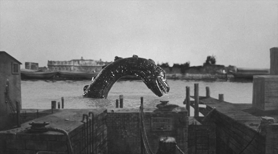 And make no mistake, nothing is done better here. Because the giant monster film had been around for so long, putting off the monster reveal until the 50-minute mark is a terrible mistake. There’s no chance that the reports of a giant monster are false, so why screw around with five-minute-long scenes of fish being filleted and tested for radiation? Just do that shit off-screen. Worse, when the monster does finally show up, it’s just a rubber sea serpent head knocking over toy boats. We need to wait another ten or so minutes before the monster comes on shore and starts wrecking the city.